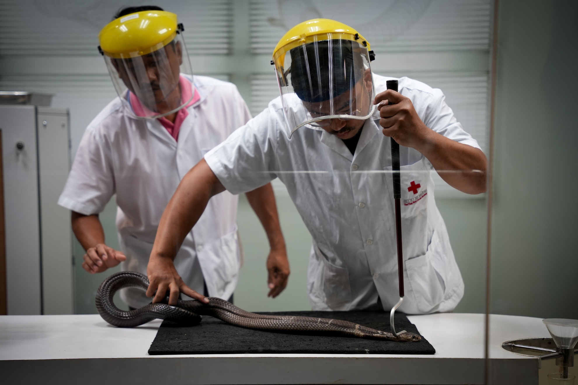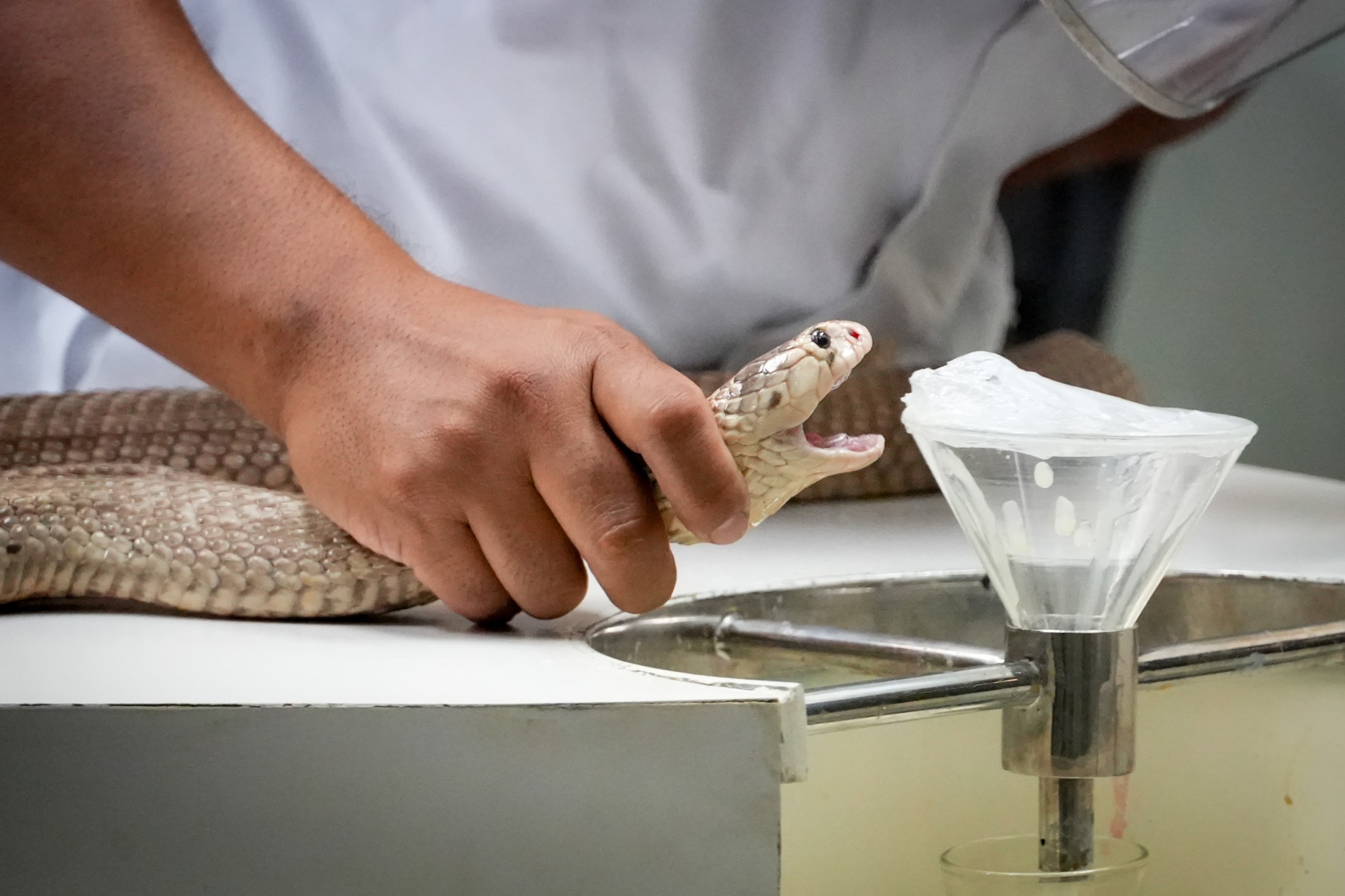 In una stanza separata da una vetrata di sicurezza, tre ricercatori lavorano indossando caschi con visiera, per proteggersi da eventuali morsi. Tutto il procedimento avviene ancora oggi in modo manuale. Il serpente morde una membrana e il liquido che ne esce viene raccolto in una provetta sterile. La mano del ricercatore preme sulle ghiandole velenifere – che possono contenere oltre mille molecole diverse – per estrarne il veleno. Poche gocce, ma letali. E fondamentali per la produzione degli antidoti.
